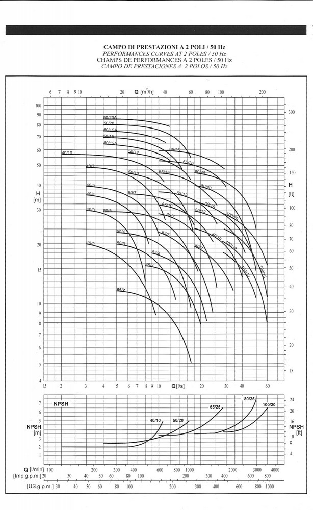 Horizontale Kreiselpumpe in Blockbauweise, IP 55 Motor, IE2, ohne Wassernorm, aus feinkörnigen Grauguß, 230 V, max. Förderleistung bei 0=61 m3/h, max. Förderhöhe bei 0= 23 m.