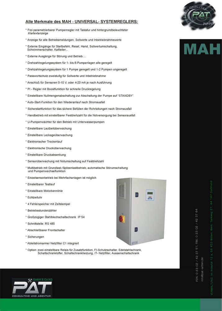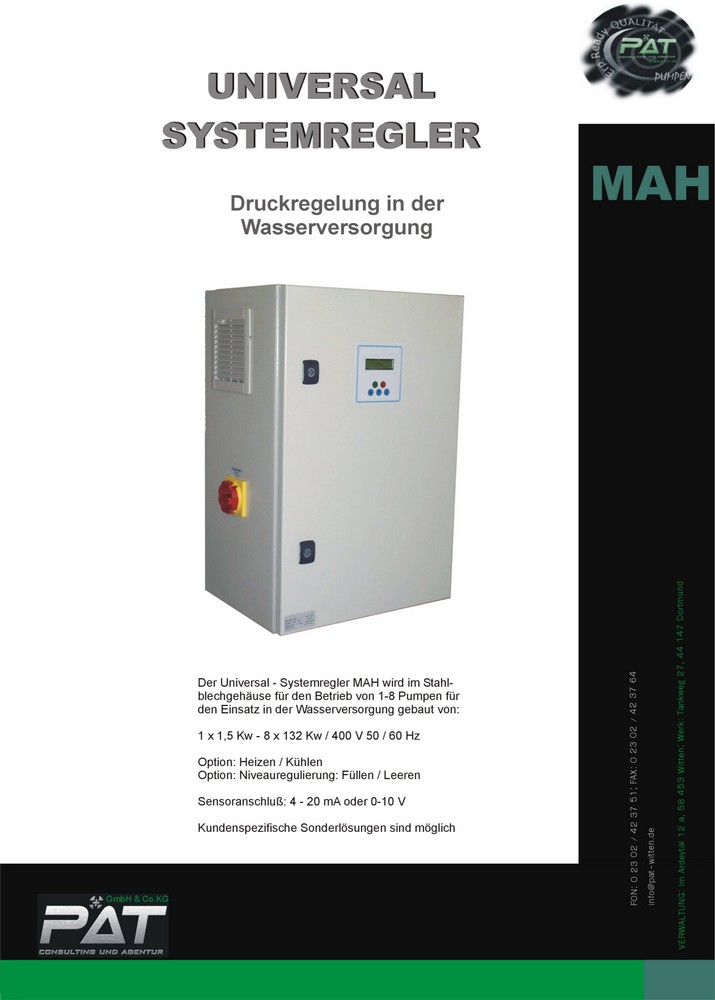 Multi-Systemregler als komplette Schaltschrankeiheit, mit Frequenzumrichter, vorparamentriert, Pumpen werden direkt an den Schaltschrank angeklemmt, keinerlei andere Absicherungen nötig. Falls bereits eine Schaltschrankeinheit zur Verfügung steht, sind sogenannte "Kits" erhältlich, zum nachträglichen Schaltschrankeinbau. (Preise gelten für 1-Pumpenregelung; Mehrpumpenregelung auf Anfrage)